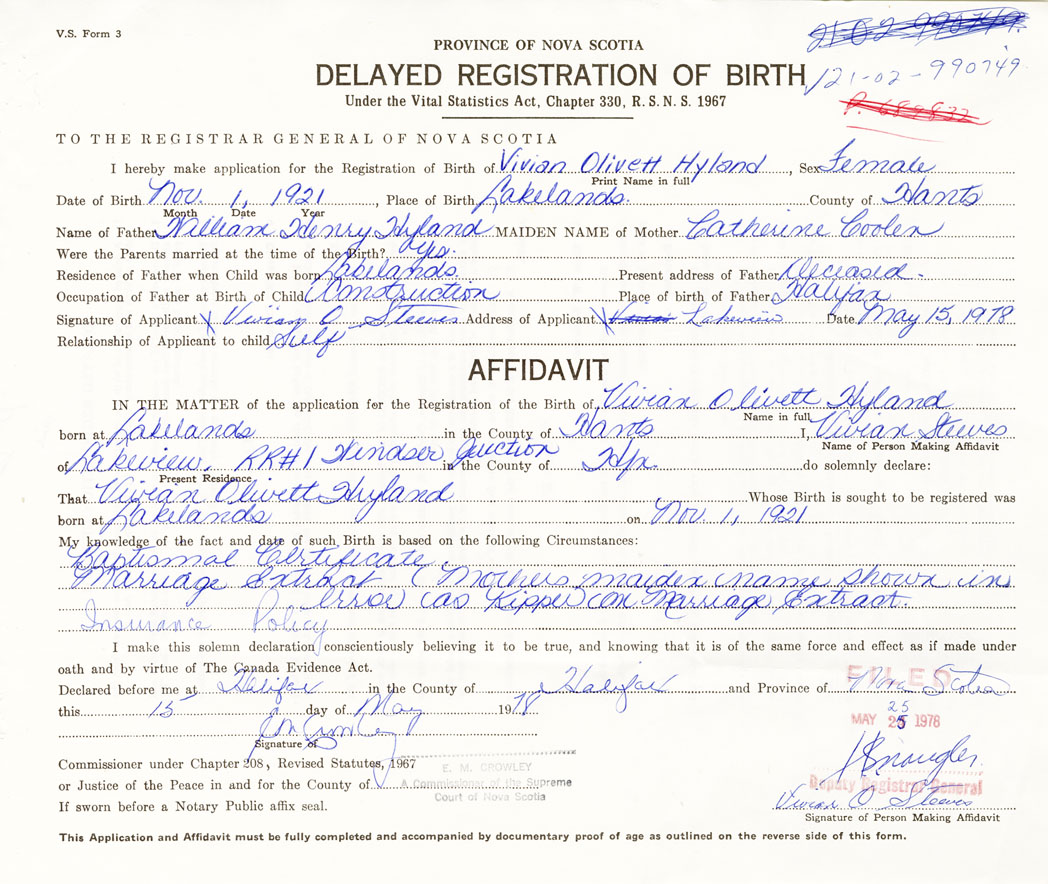 That Vivian OlivettHyland Whose Birth is sought to be registered was