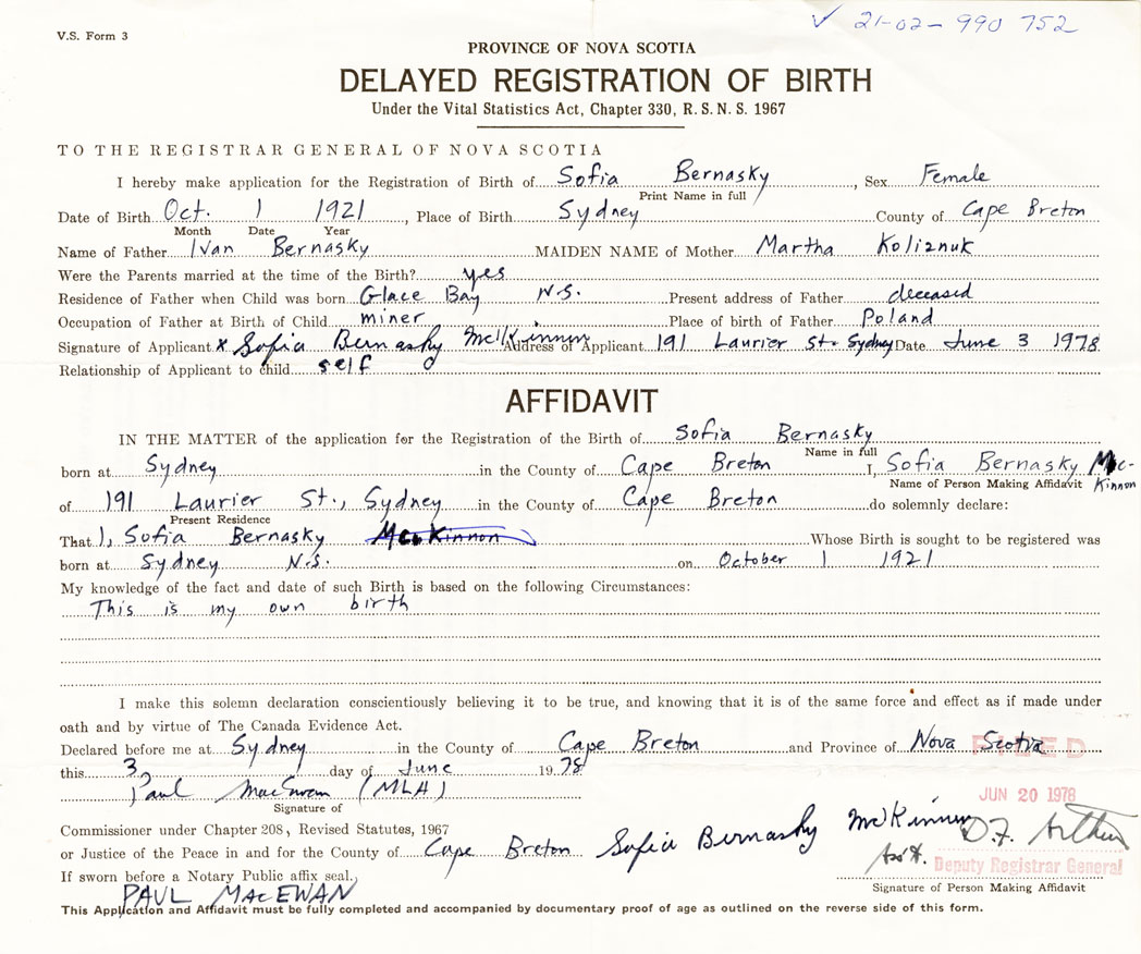 Signature of Applicant Sofia Bernasky McKinnon Address of Applicant 191 Laurier St. Sydney Date June 3, 1978