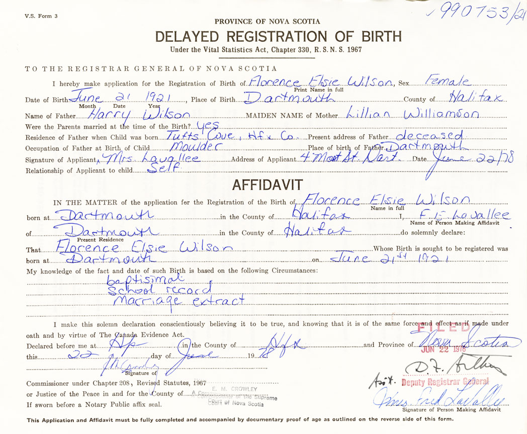 Date of Birth June 21, 1921 Place of Birth DartmouthCounty of Halifax