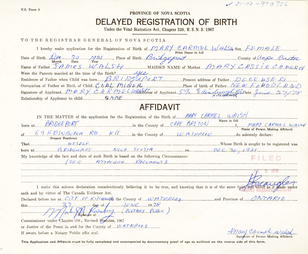 I hereby make application for the Registration of Birth of Mary CarmelWalsh Sex Female