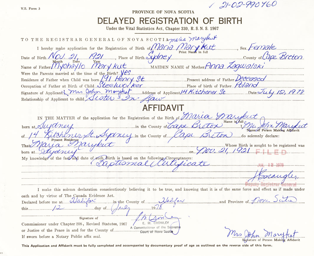 Signature of Applicant Mrs. John Marykut Address of Applicant 14 Kitchener St. Sydney Date July 12, 1978