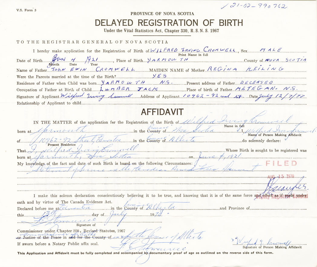 21. Name and Post Office address of Informant Wilfred Irving Cromwell 10962-92nd St. Edmonton, Alberta