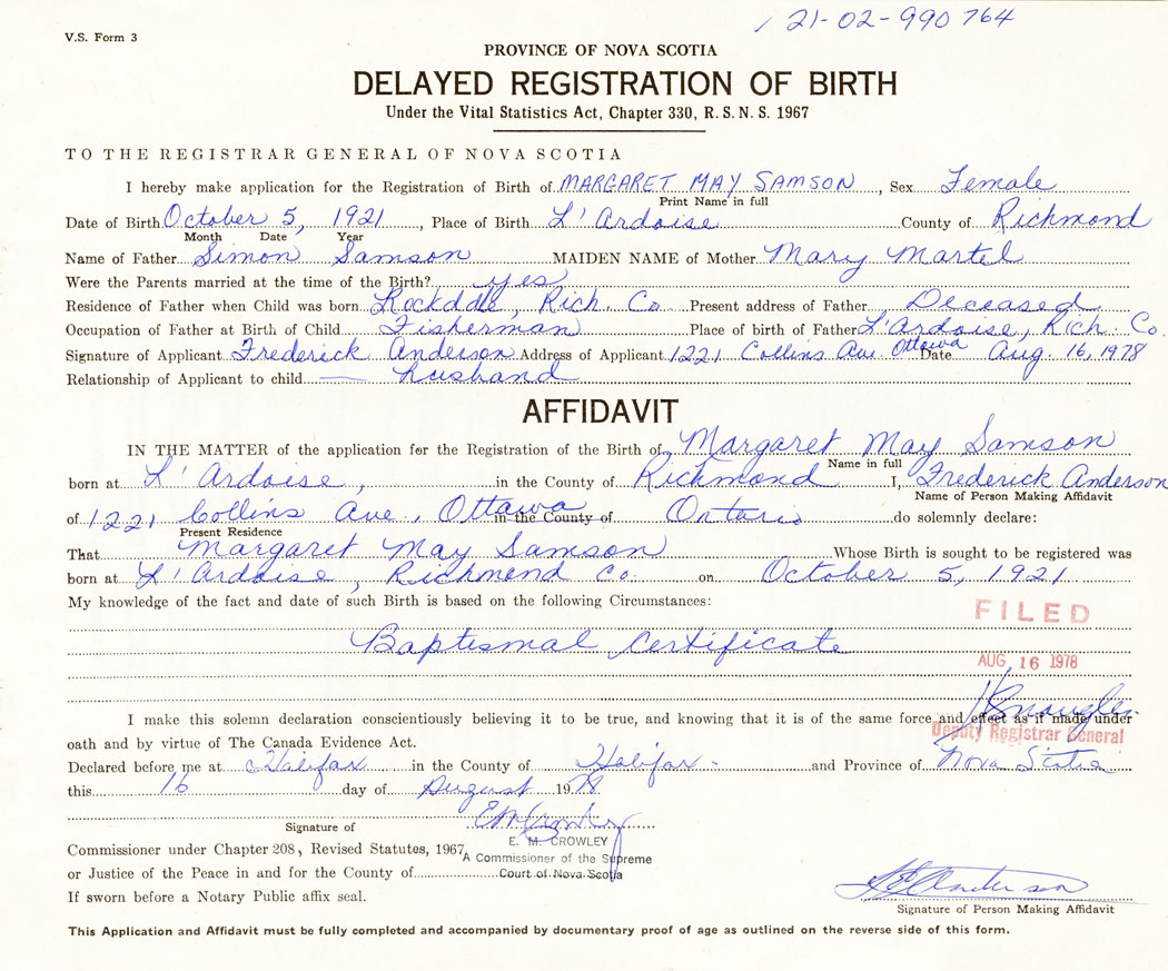 IN THE MATTER of the application for the Registration of the Birth of Margaret MaySamson
