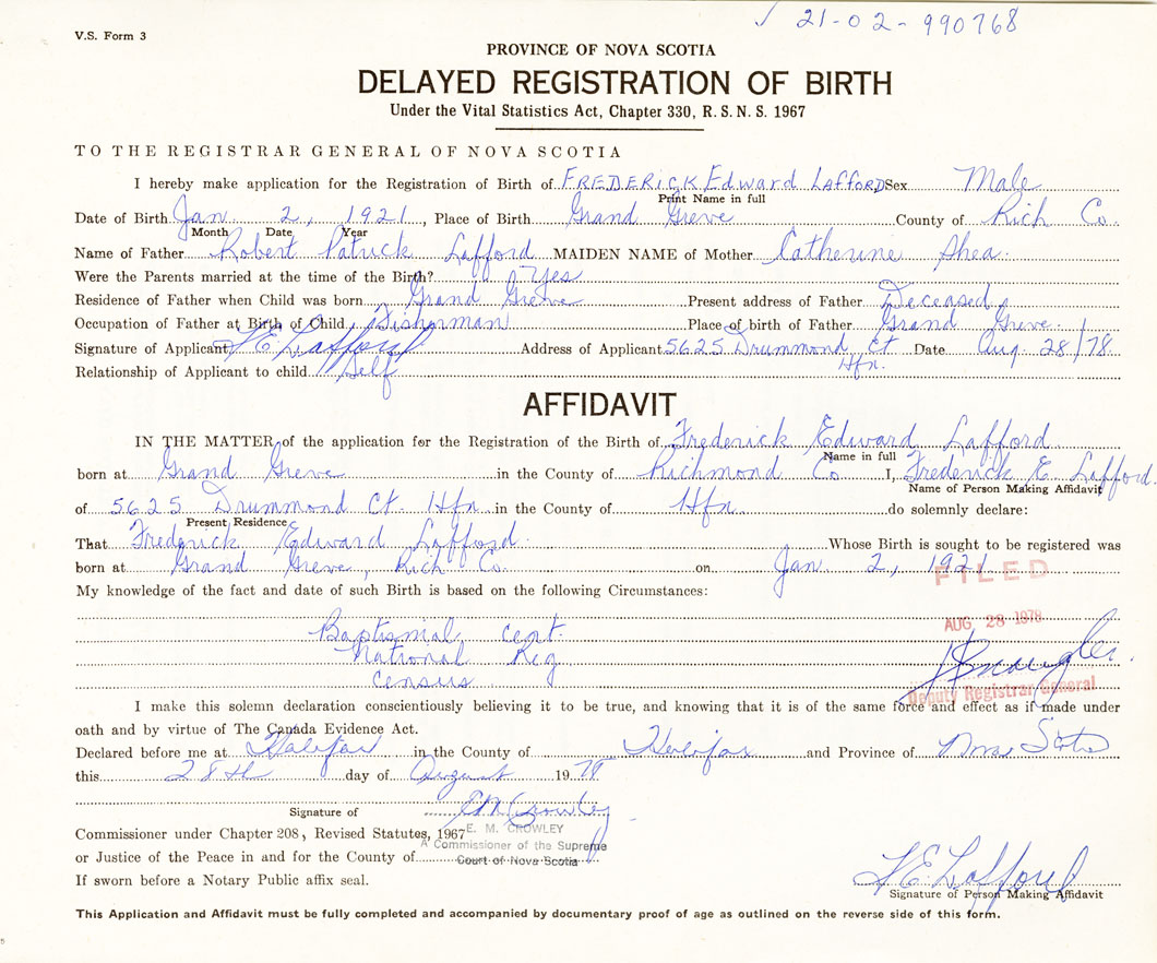 I hereby make application for the Registration of Birth of Frederick EdwardLafford Sex Male