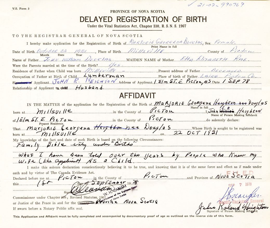 Date of Birth October 22, 1921 Place of Birth MillsvilleCounty of Pictou
