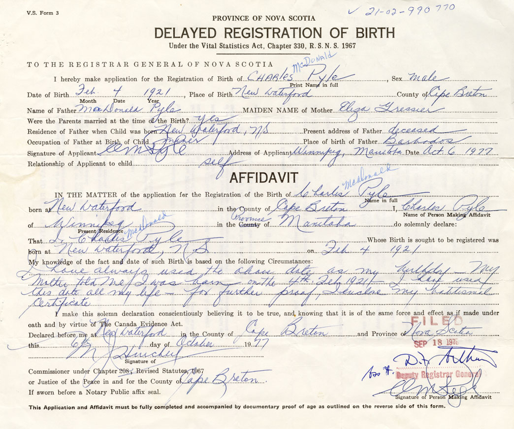 IN THE MATTER of the application for the Registration of the Birth of Charles McDonaldPyle