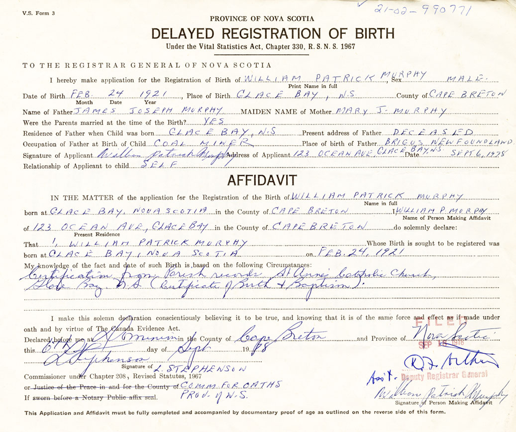 Date of Birth February 24, 1921 Place of Birth Glace BayCounty of Cape Breton