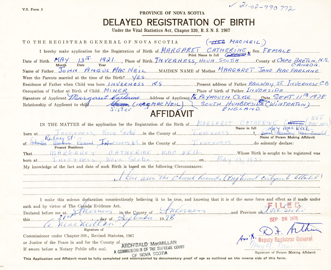 IN THE MATTER of the application for the Registration of the Birth of Margaret CatherineMacNeil
