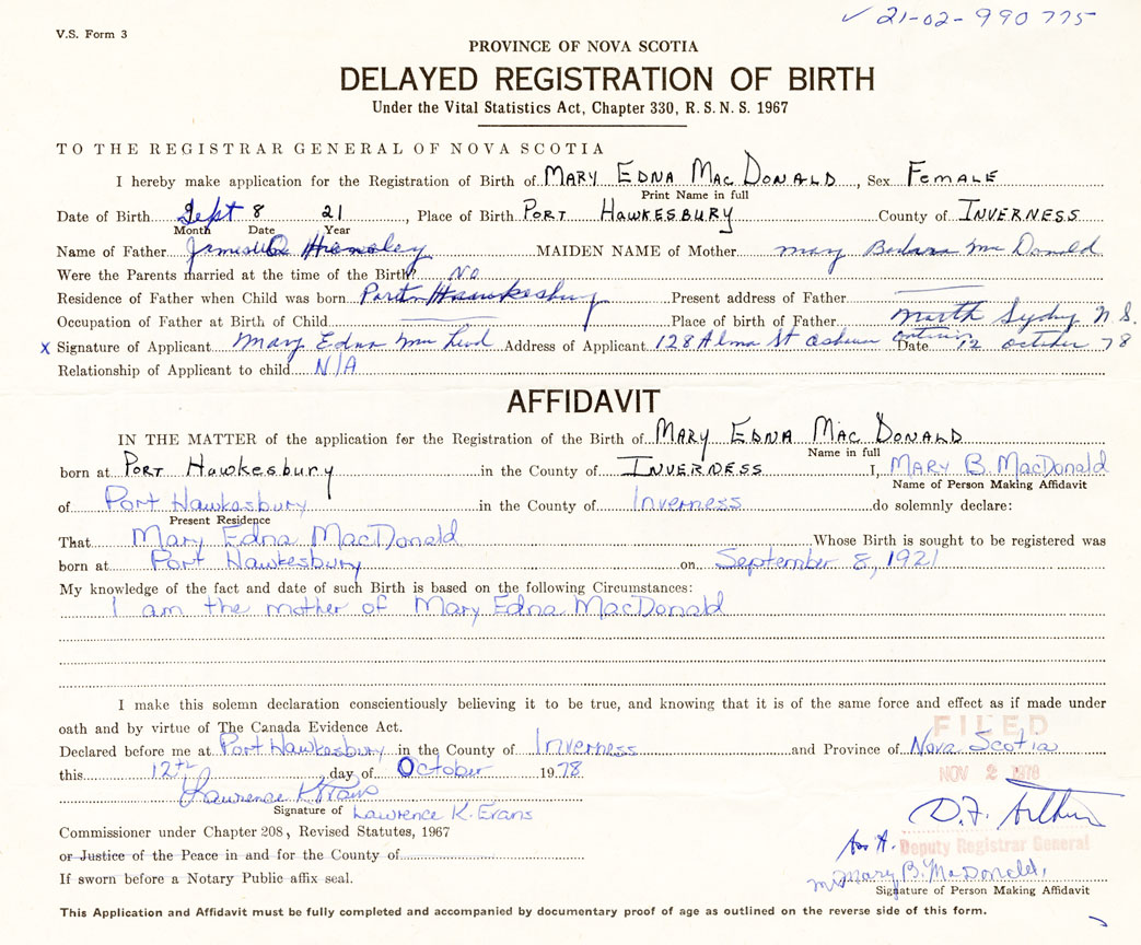 I hereby make application for the Registration of Birth of Mary EdnaMacDonald Sex Female