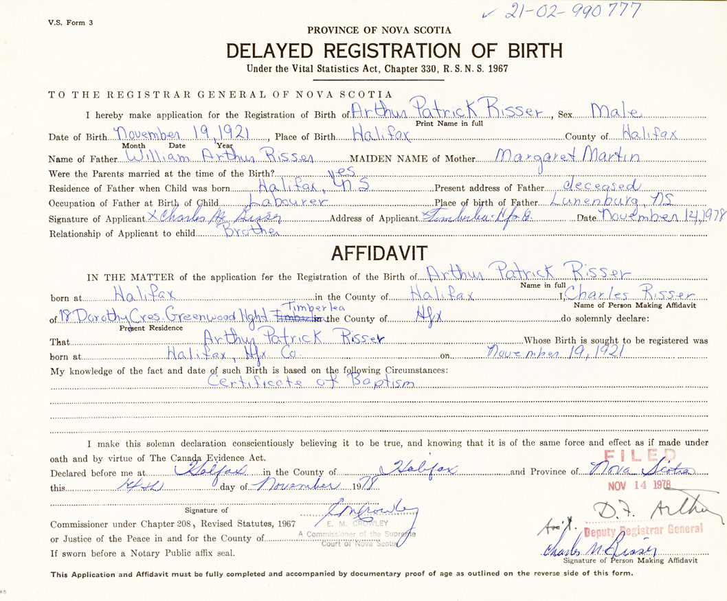 I hereby make application for the Registration of Birth of Arthur PatrickRisser Sex Male