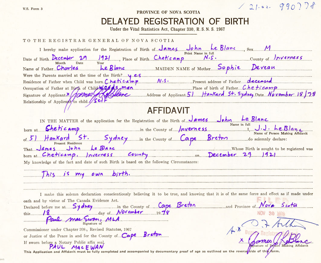 IN THE MATTER of the application for the Registration of the Birth of James JohnLeBlanc