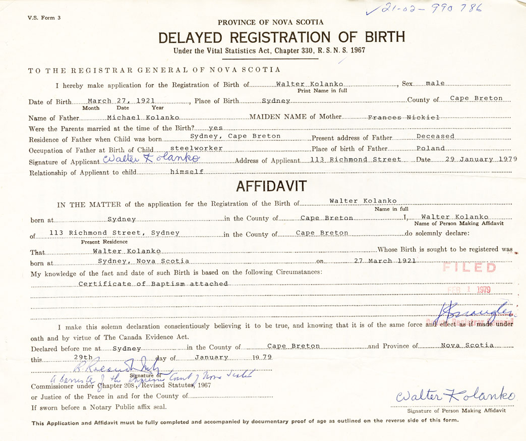 I hereby make application for the Registration of Birth of WalterKolanko Sex Male
