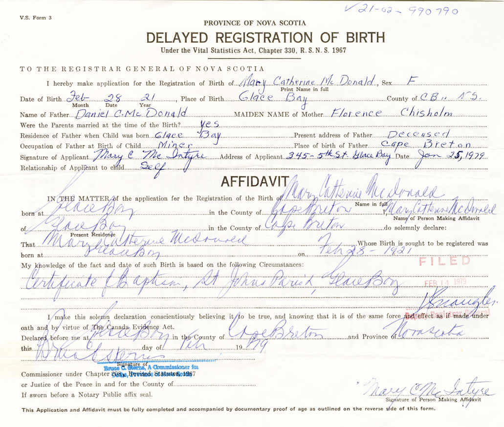 Signature of Applicant Mary C. McIntyre Address of Applicant 345-5th St. Glace Bay Date January 25, 1979