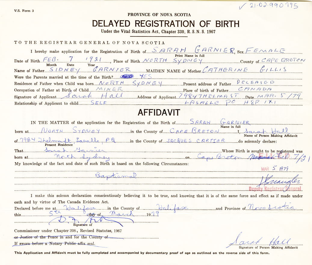 Date of Birth February 7, 1921 Place of Birth North SydneyCounty of Cape Breton