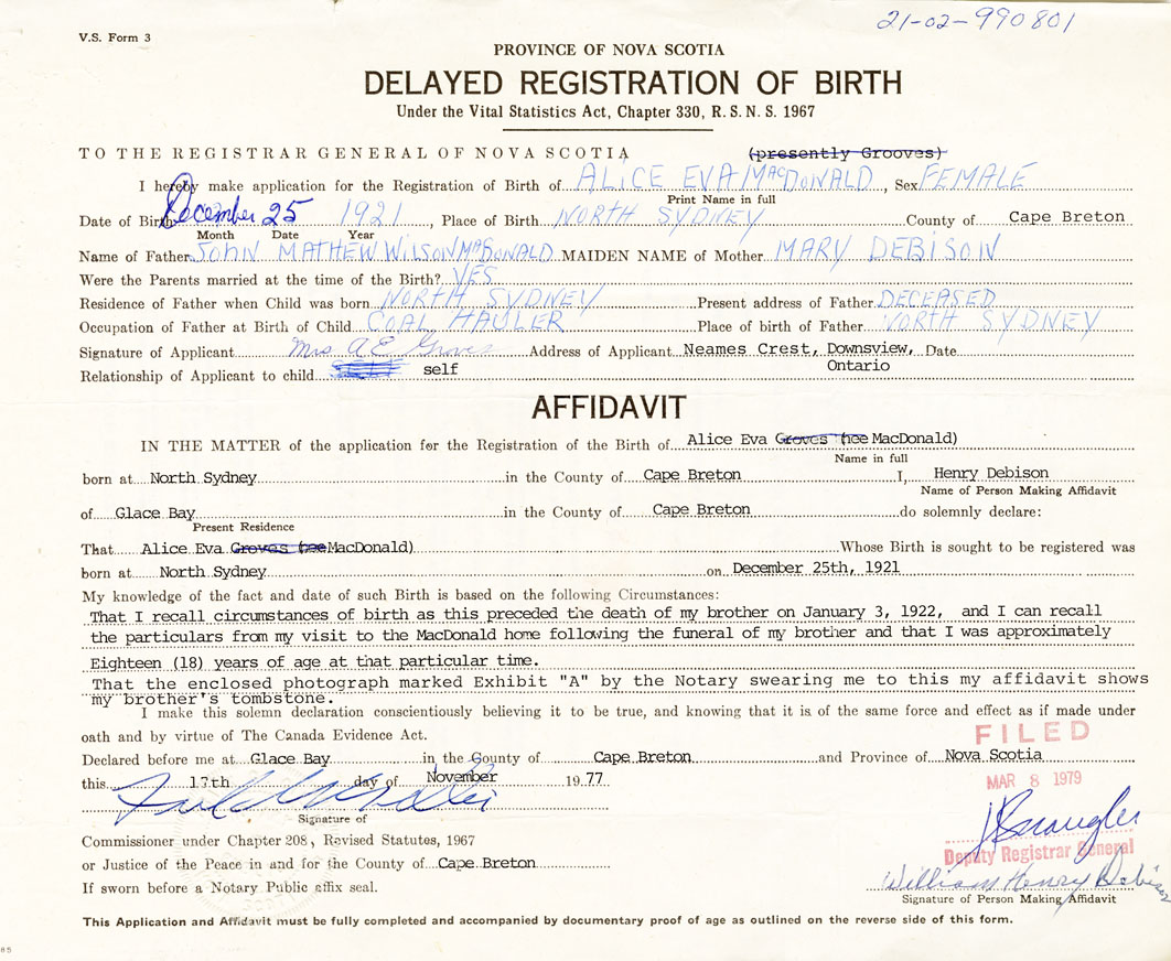 That I recall circumstances of birth as this preceded the death of my brother on January 3, 1922, and I can recall the particulars from my visit to the MacDonald home following the funeral of my brother and that I was approximately Eighteen (18) years of age at that particular time. That the enclosed photograph marked Exhibit "A" by the Notary swearing me to this my affidavit shows my brother's tombstone.