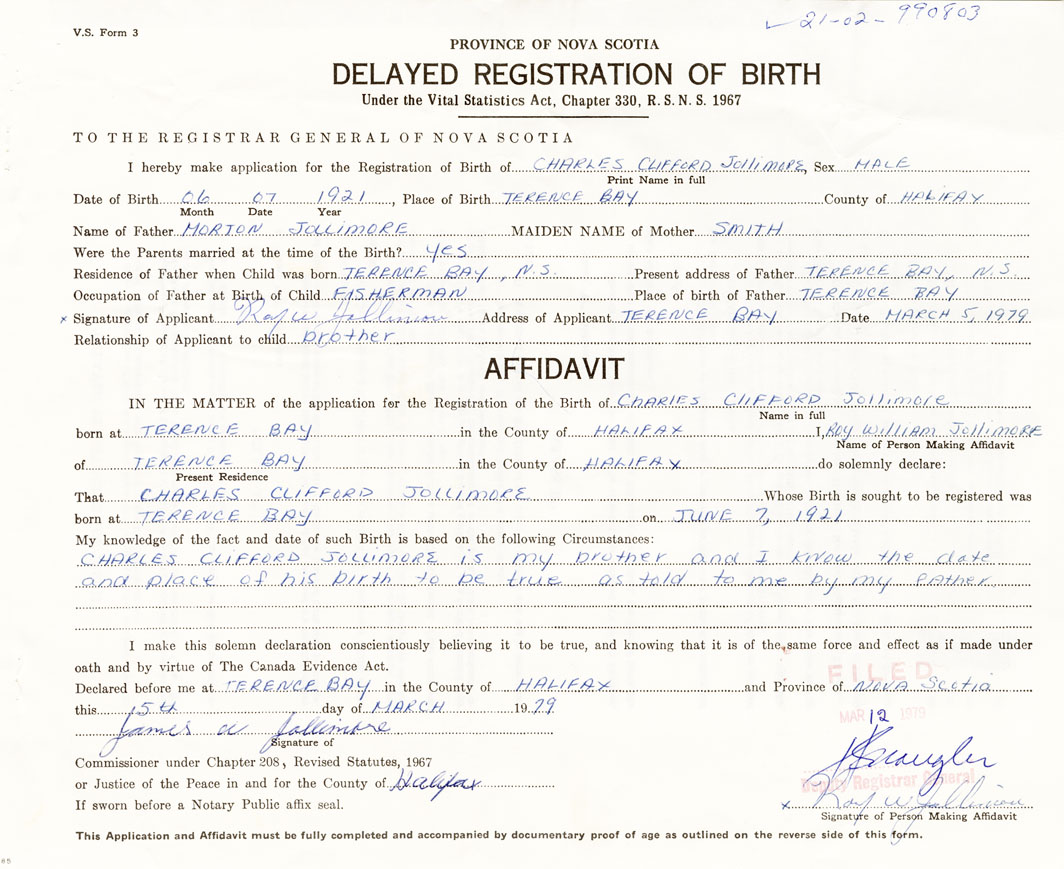 Date of Birth June 7, 1921 Place of Birth Terence BayCounty of Halifax