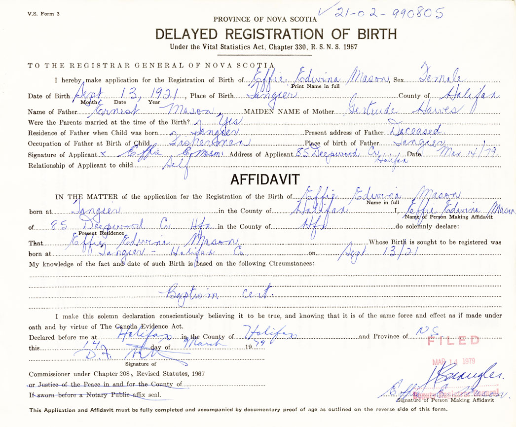 Signature of Applicant Effie E. Mason Address of Applicant 85 Deepwood Cr. Halifax Date March 14, 1979