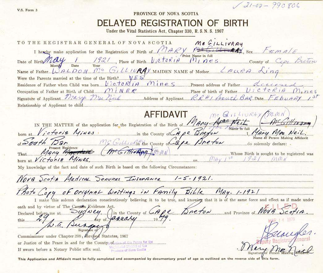 21. Name and Post Office address of Informant Mary MacNeil RR1 South Bar