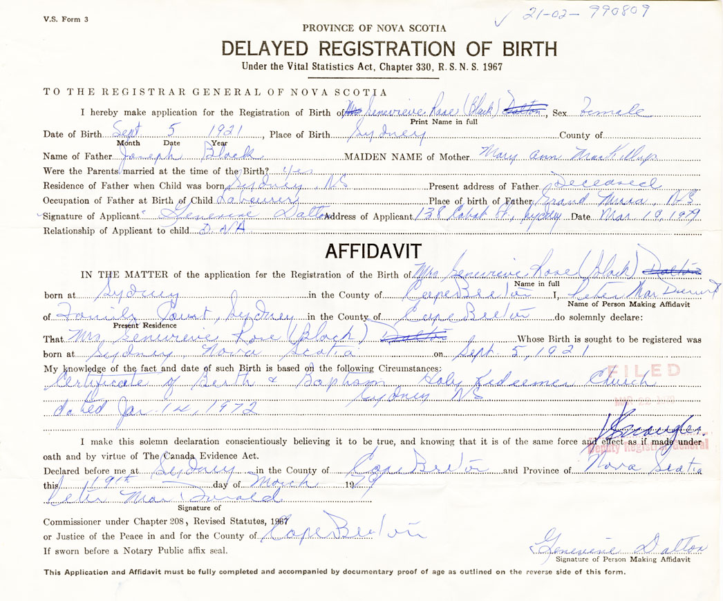 Date of Birth September 5, 1921 Place of Birth SydneyCounty of Cape Breton
