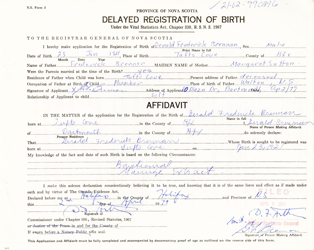 Date of Birth January 23, 1921 Place of Birth Tufts CoveCounty of Halifax