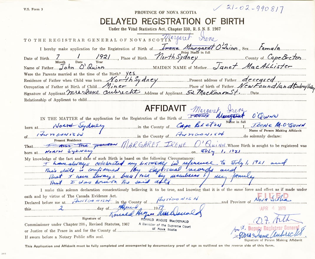 21. Name and Post Office address of Informant Mrs. Irene Aubrecht 52 MacKinnon St. Antigonish