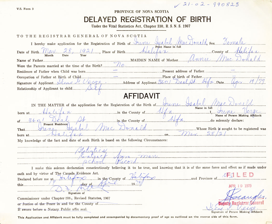 Signature of Applicant Irene I. Verge Address of Applicant 3601 Deal St. Halifax Date April 19, 1979