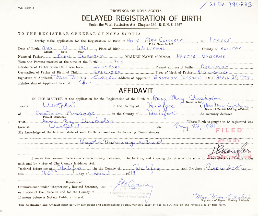 That Anna MayChisholm Whose Birth is sought to be registered was