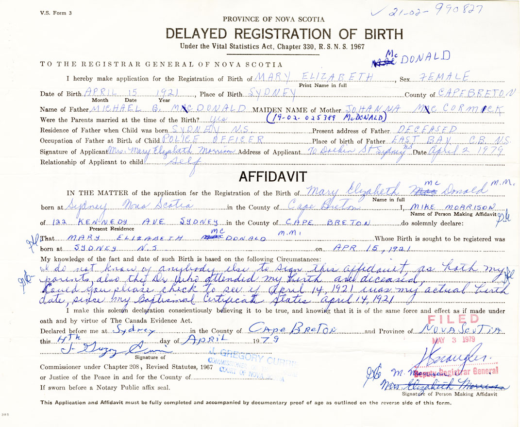 Date of Birth April 15, 1921 Place of Birth SydneyCounty of Cape Breton