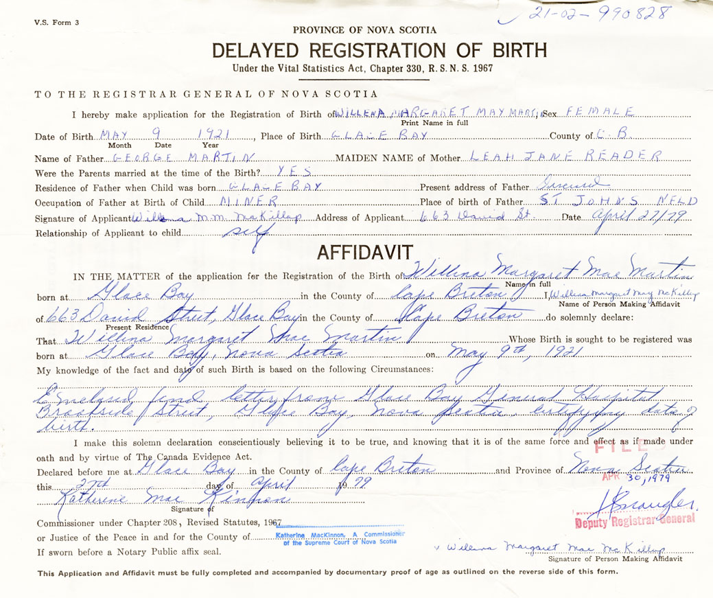 Date of Birth May 9, 1921 Place of Birth Glace BayCounty of Cape Breton