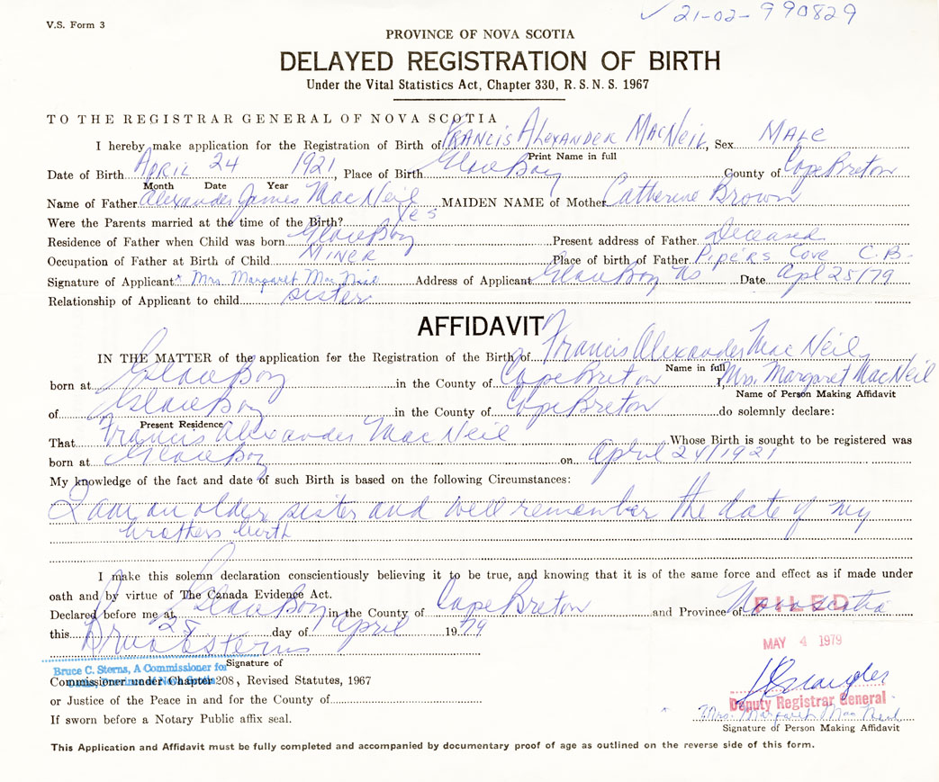 Date of Birth April 24, 1921 Place of Birth Glace BayCounty of Cape Breton