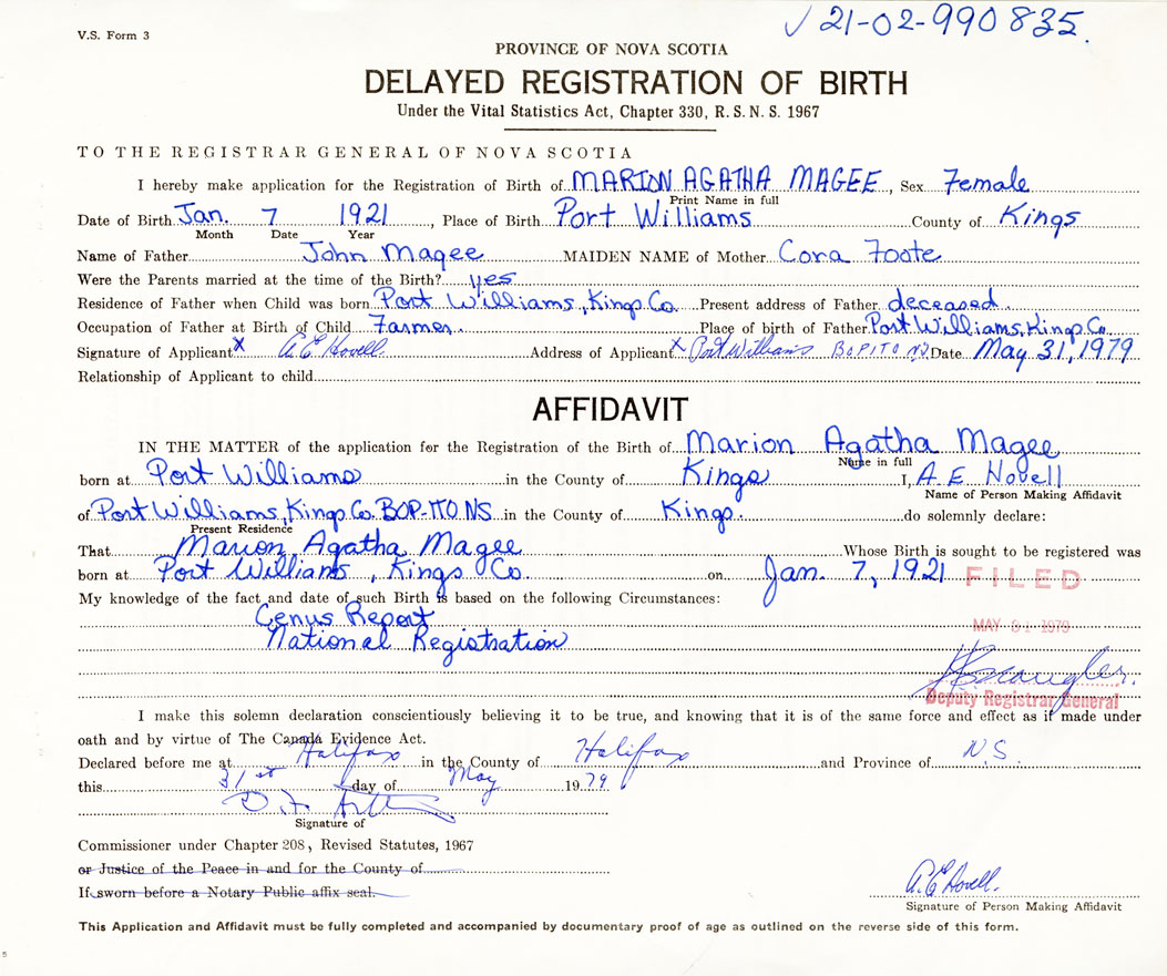 21. Name and Post Office address of Informant A.E. Hovell Port Williams