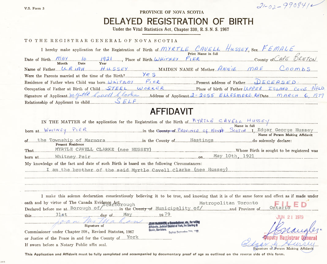 IN THE MATTER of the application for the Registration of the Birth of Myrtle CavellHussey