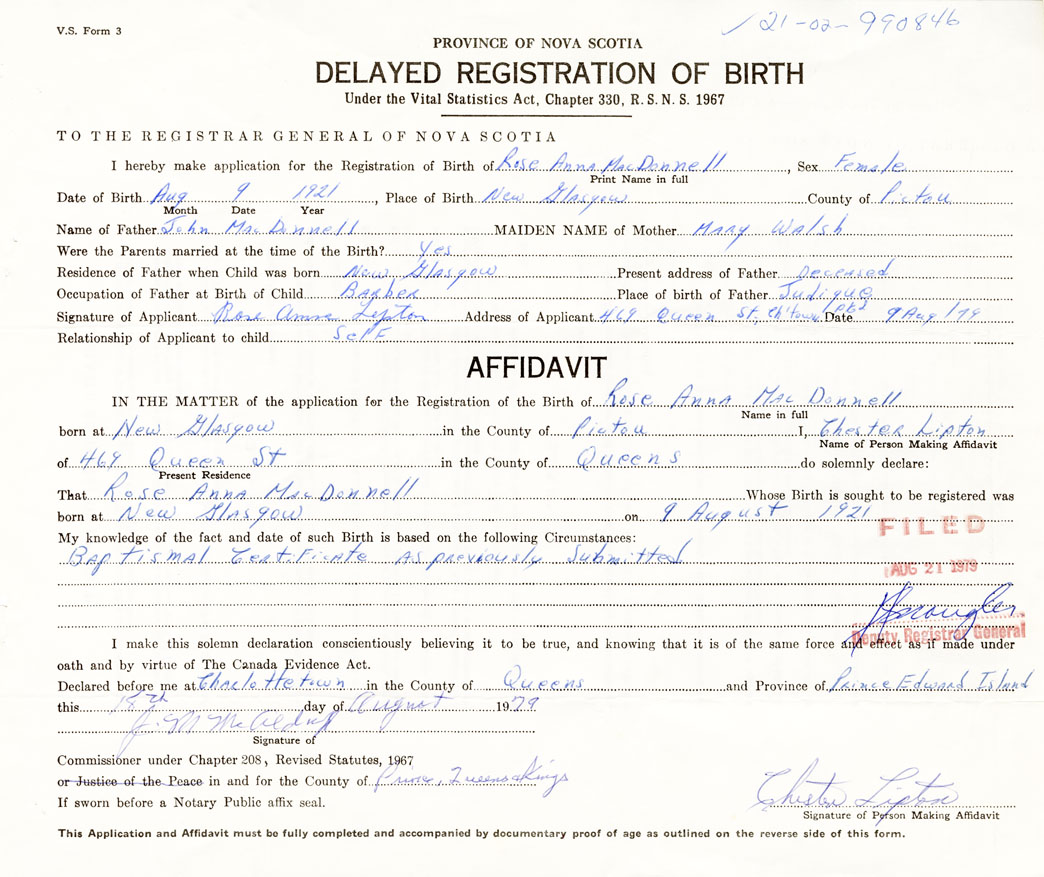 Date of Birth August 9, 1921 Place of Birth New GlasgowCounty of Pictou