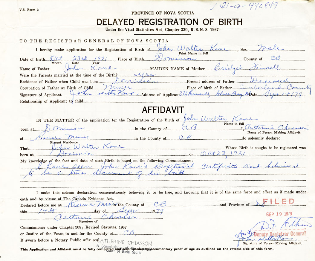 21. Name and Post Office address of Informant John Walter Kane 372 Reserve St. Glace Bay