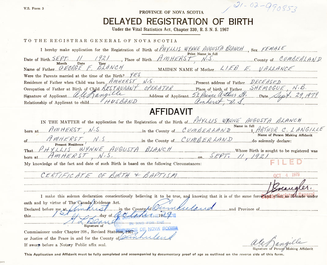 IN THE MATTER of the application for the Registration of the Birth of Phyllis Wynne AugustaBlanch