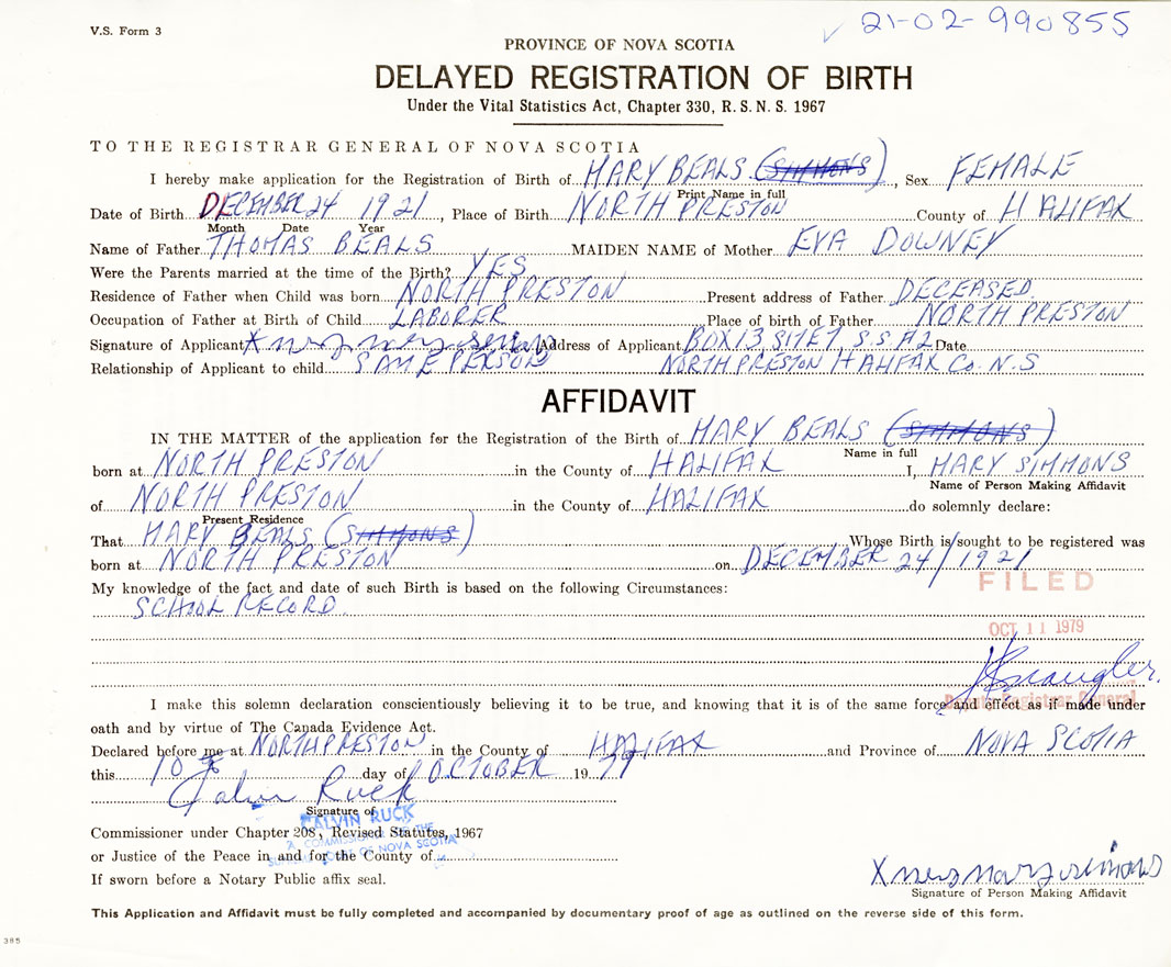 born at North Preston Halifax County on December 24, 1921