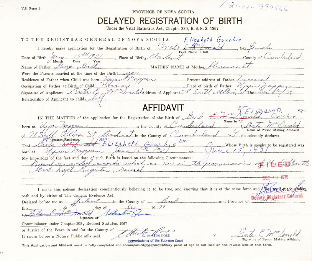 I hereby make application for the Registration of Birth of Greta ElizabethGouchie Sex Female