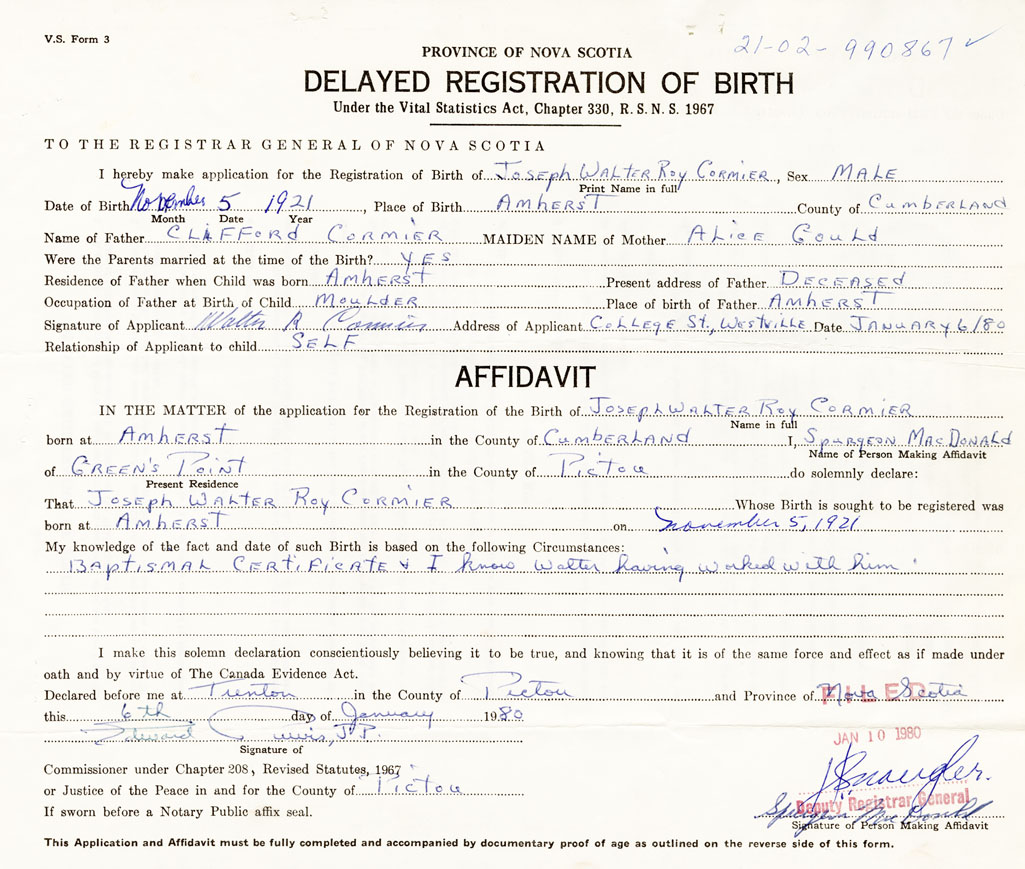 That Joseph Walter RoyCormier Whose Birth is sought to be registered was