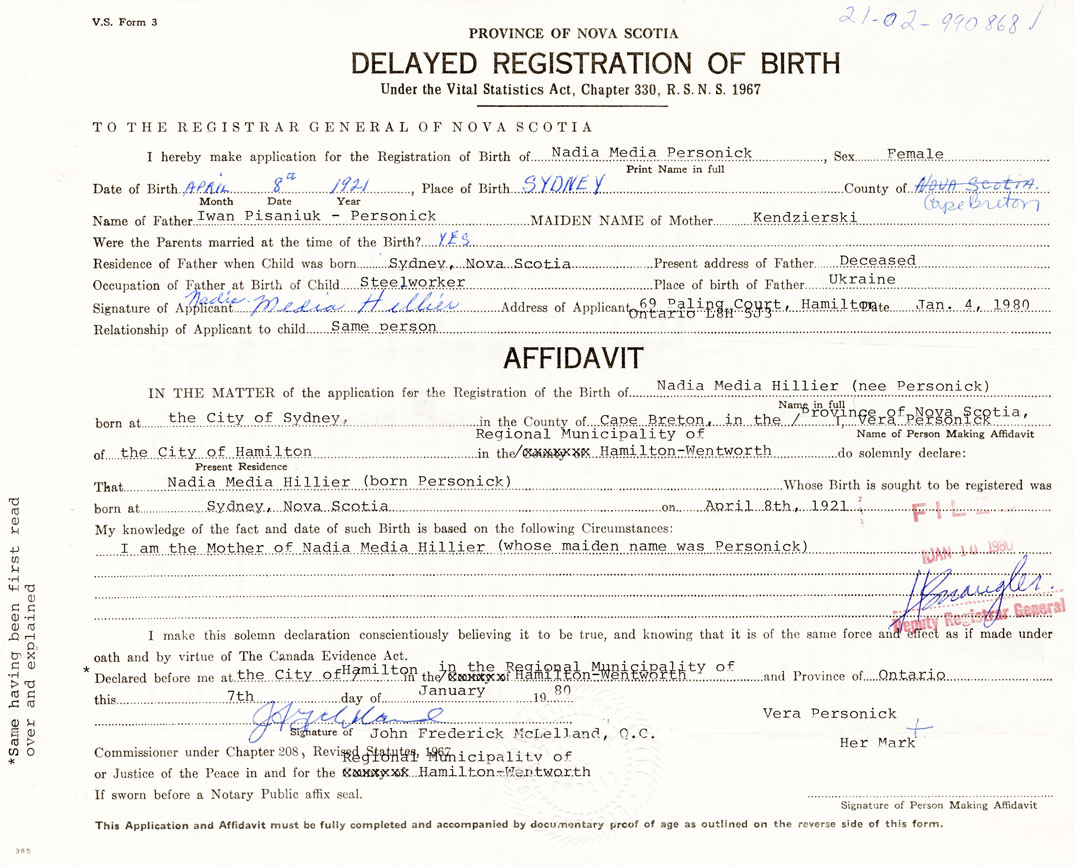IN THE MATTER of the application for the Registration of the Birth of Nadia MediaPersonick