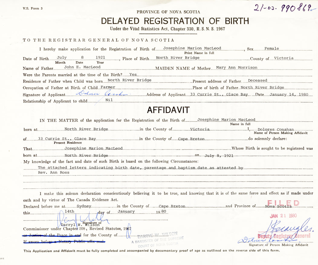 I hereby make application for the Registration of Birth of Josephine MarionMacLeod Sex Female