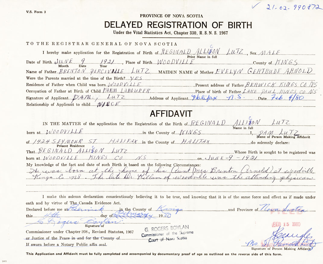 I hereby make application for the Registration of Birth of Reginald AlliconLutz Sex Male