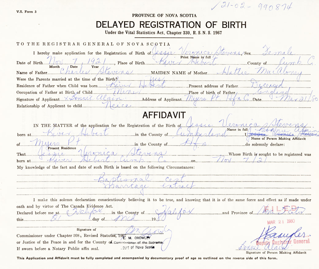 Date of Birth November 7, 1921 Place of Birth River HebertCounty of Cumberland