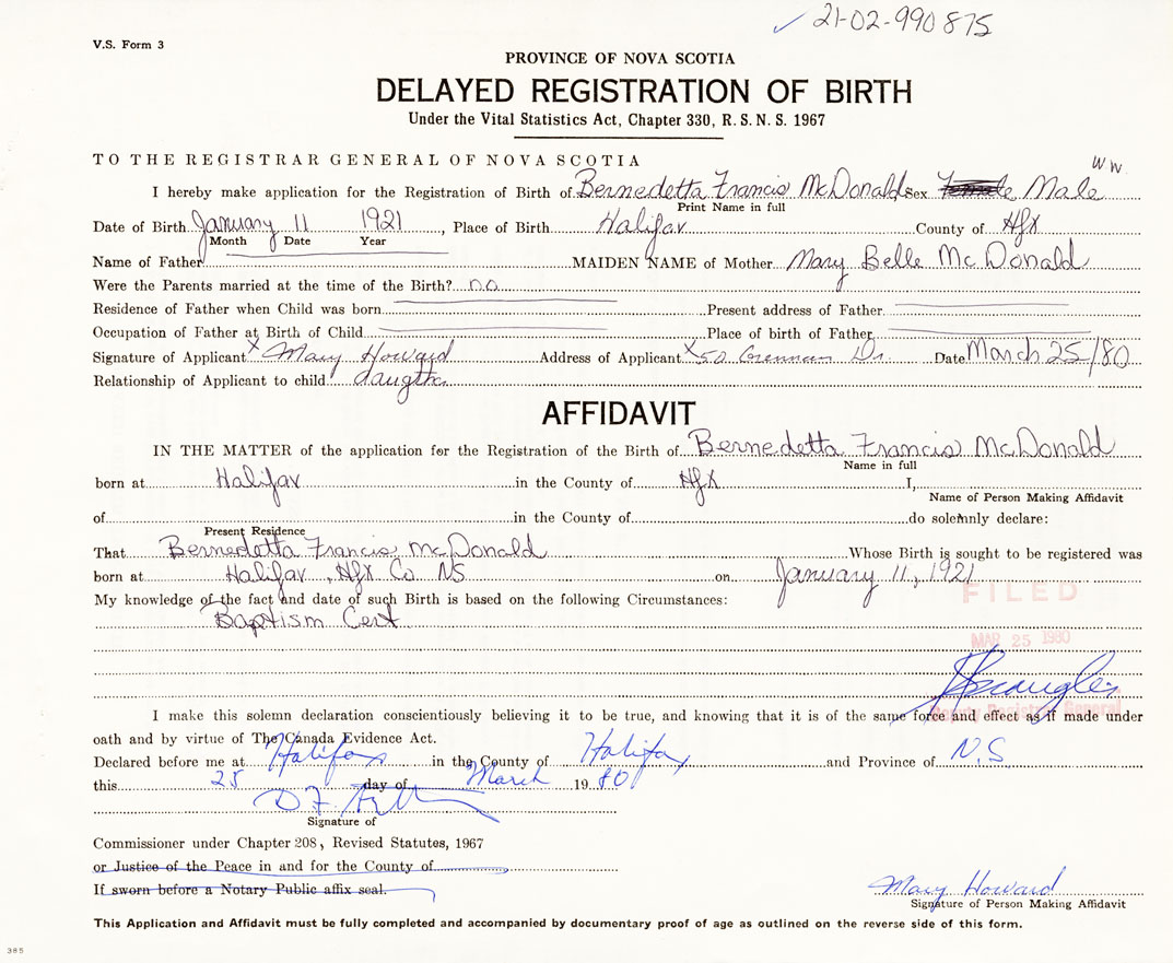 I hereby make application for the Registration of Birth of Bernedetta FrancisMcDonald Sex Male
