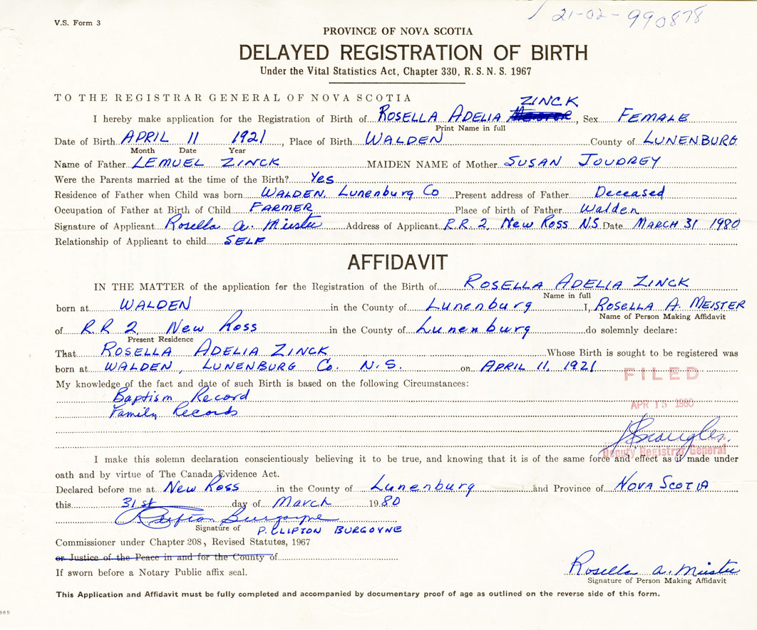 Name of Father Lemuel Zinck MAIDEN NAME of Mother Susan Joudrey