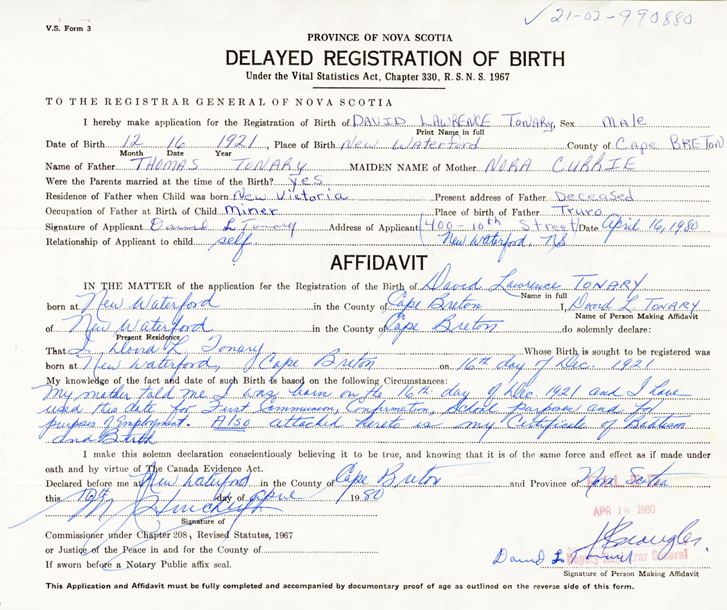 I hereby make application for the Registration of Birth of David LawrenceTonary Sex Male