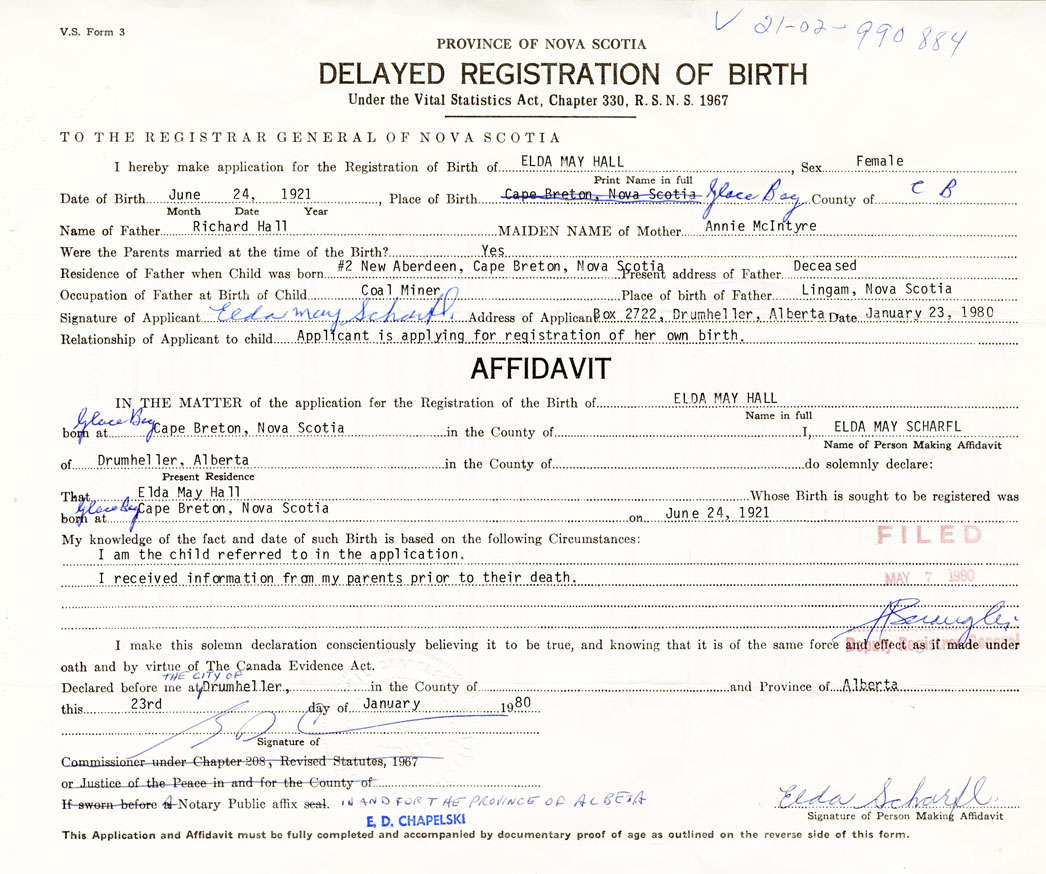 I hereby make application for the Registration of Birth of Elda MayHall Sex Female