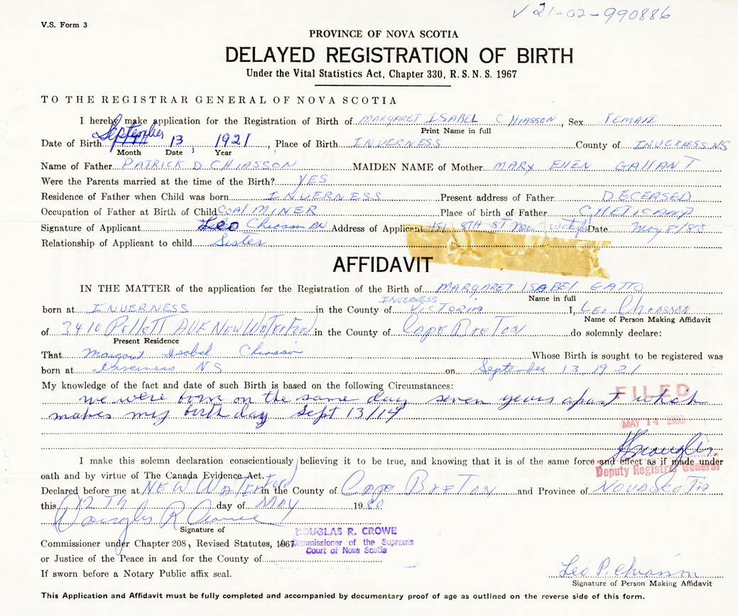 I hereby make application for the Registration of Birth of Margaret IsabelChiasson Sex Female