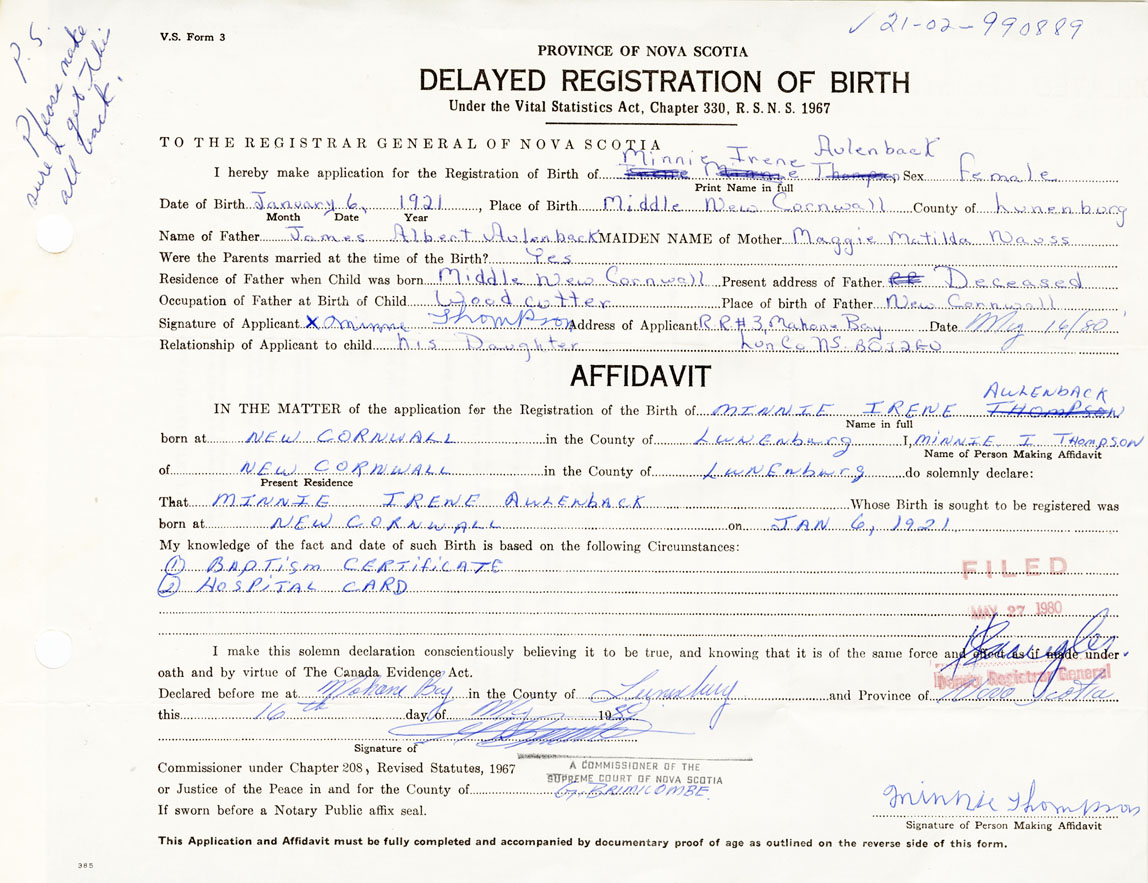 Signature of Applicant Minnie Thompson Address of Applicant RR3 Mahone Bay Date May 16, 1980