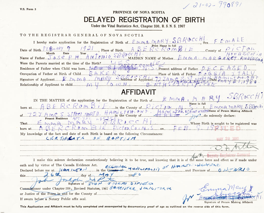 Signature of Applicant Emma Mary Sbrocchi Address of Applicant 72 James St. North Hamilton, Ontario Date May 21, 1980