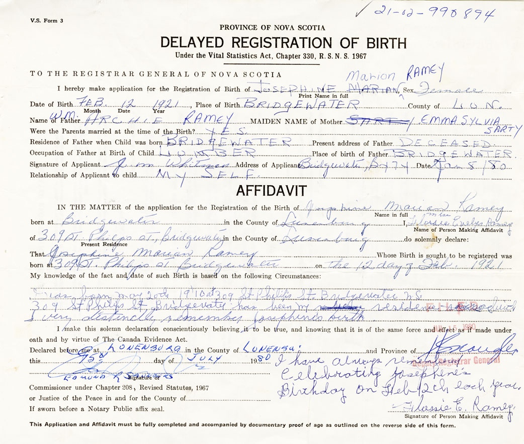 I was born May 2nd 1910 at 309 St. Philips St. Bridgewater N.S. 309 St. Philips St. Bridgewater has been my residence. I very distinctly remember Josephines birth.